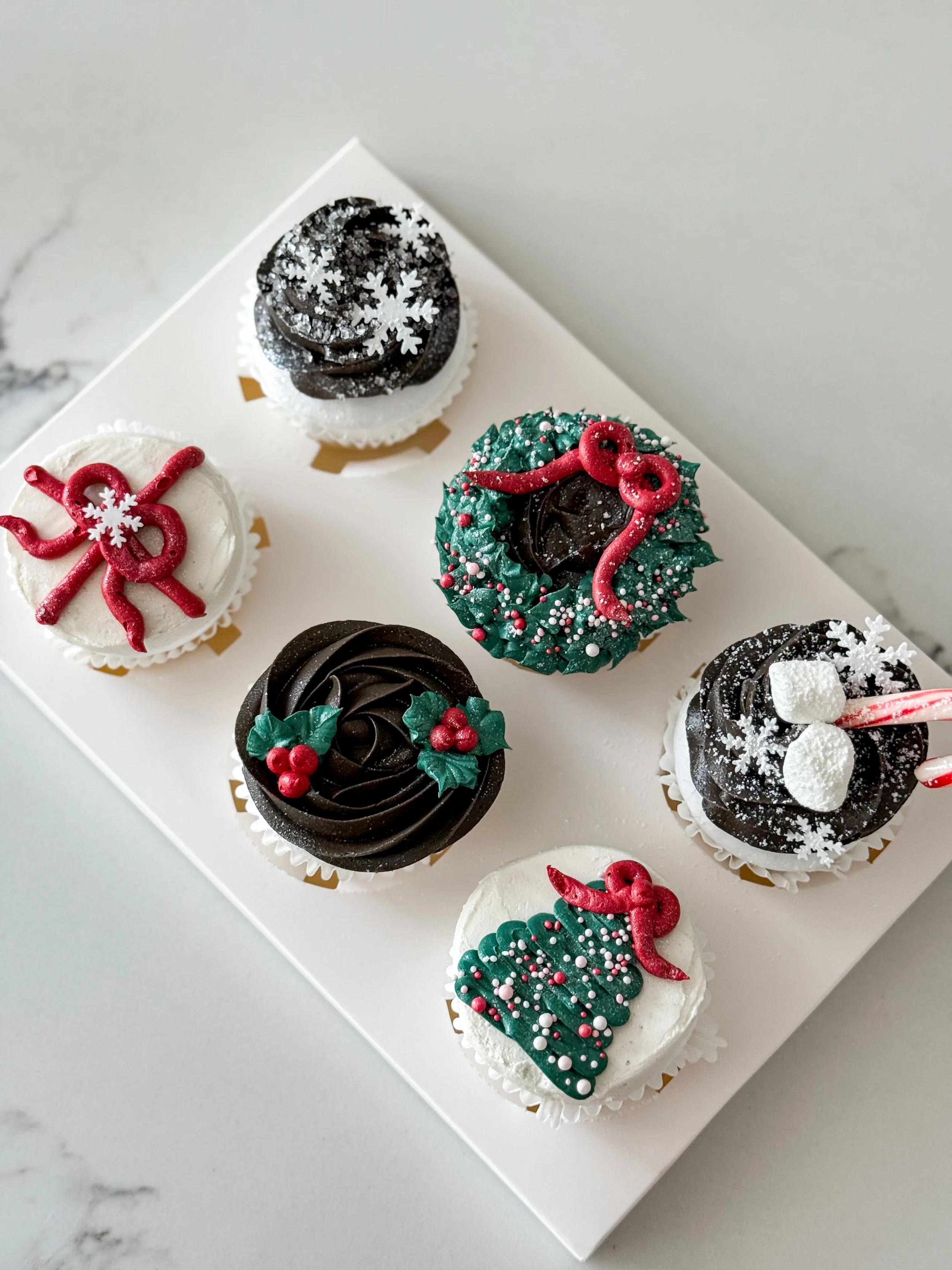 Learn to decorate three festive funfetti and three red velvet cupcakes by mixing your own buttercream colors, decorating with a variety of piping tips and topping with sprinkles, mini candy canes, marshmallows, wafer snowflakes and edible glitter. Once you’re finished, take your creations home in a cute gift box!